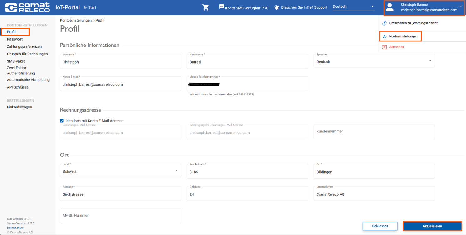 ➔ Im IoT-Portal oben rechts unter ihrem Namen und E-Mail-Adresse unter Kontoeinstellung/Profil.