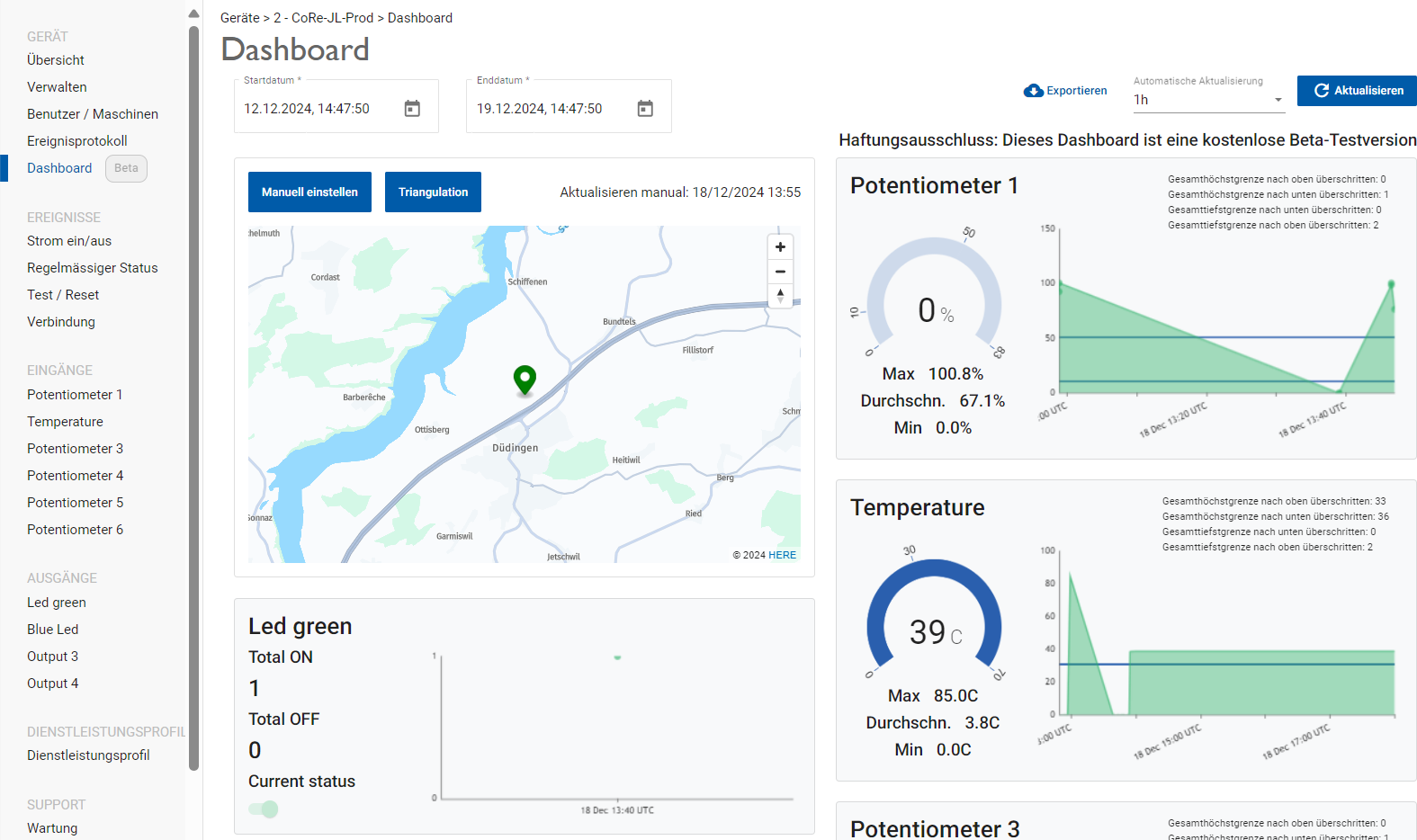 • Dashboard | Der neue Menüpunkt Dashboard zeigt die Position des Geräts und die Werte der Ein- und Ausgänge in grafischer Form an. Das Dashboard kann manuell über die Schaltfläche Aktualisieren oder automatisch (Zeitschritte: 10 s, 30 s, 1 min, 5 min, 15 min, 30 min, 1 h, 2 h) aktualisiert werden. Die Daten können über die Schaltfläche Exportieren als CSV-Datei in Tabellenform heruntergeladen werden.