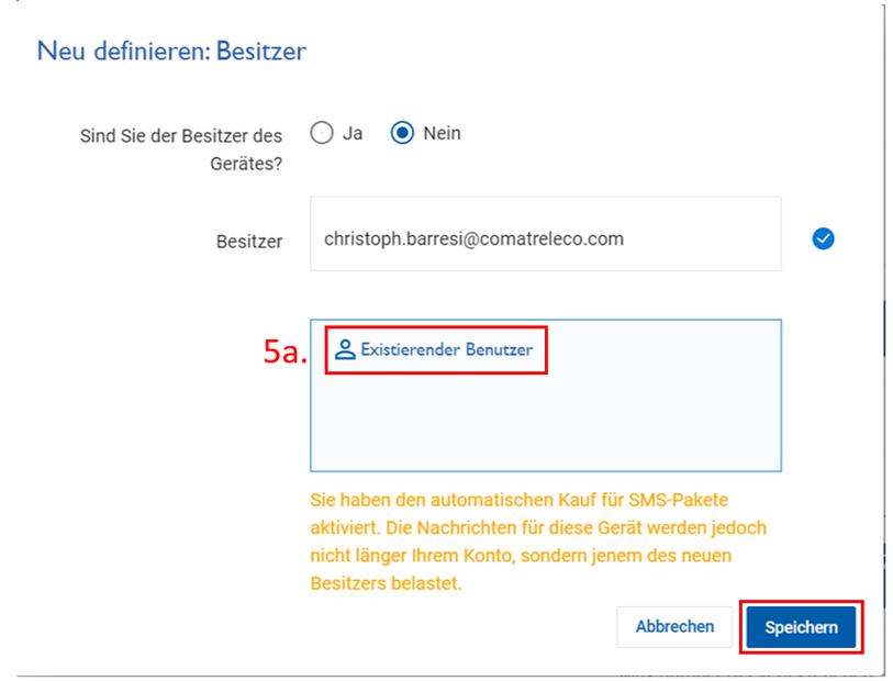 Solange die Einladung nicht akzeptiert wurde, bleibt das Gerät im Besitz der bisherigen Eigentümerin oder des bisherigen Eigentümers, einschließlich der laufenden Abrechnung.