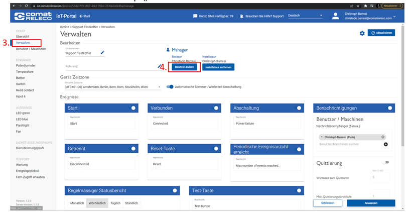 Um den Besitzer eines CMS‑10R Gerätes im IoT‑Portal zu wechseln, gehen Sie wie folgt vor.